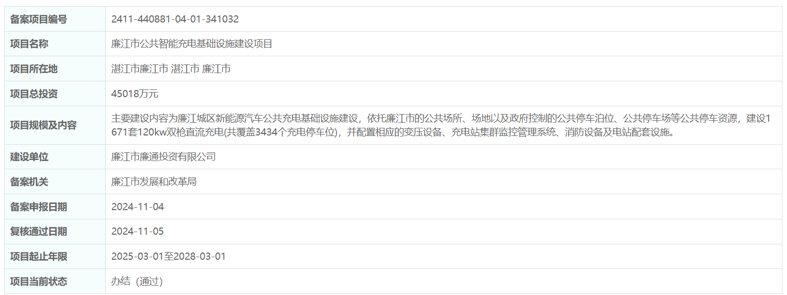 近日,廣東省廉江市公共智能充電基礎設施建設項目備案通過。